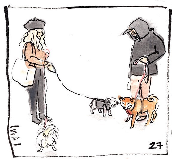 My favorite subjects: Nikki and Denis and little Luna on the stairs. :) #inktober2021 #exploration #ink #painting #sketching #urbansketch #brooklynpeople #gouache #watercolor #peoplewatching #humans #dogsofbrooklyn instagr.am/p/CVdkupIvrNV/