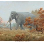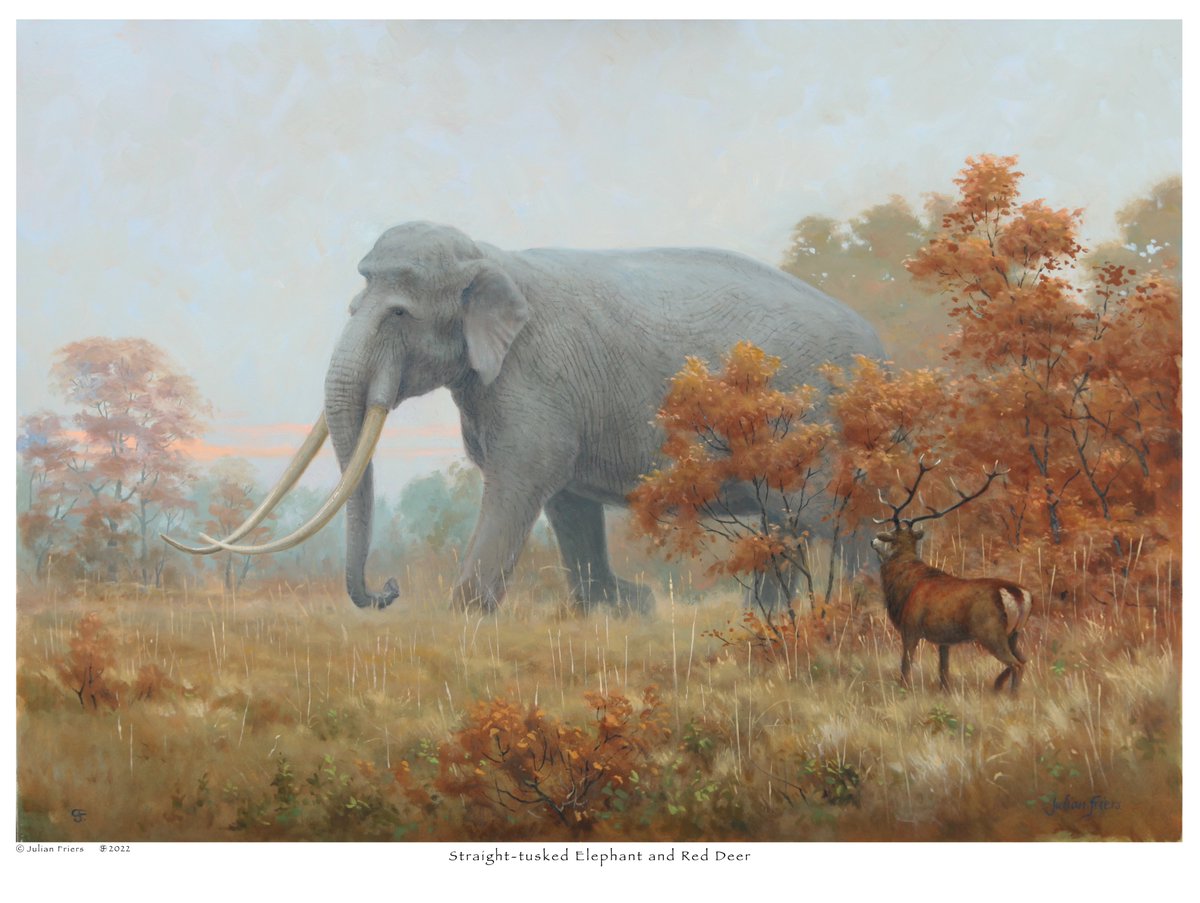 The straight-tusked elephant was a huge animal that ranged right across Europe until its extinction around 30,000 years ago. Straight-tusked elephant and red deer. Oil on canvas. Now available as a print! Have a great weekend! #wildlifeart #extinction #extinctanimals #paleoart
