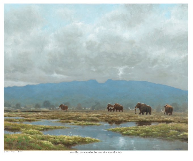 Woolly Mammoths north of the Devil’s Bit in Tipperary. What was probably the largest ever terrestrial animal in Ireland had disappeared from here around 50 thousand years ago. Available as a signed print over at bedrockprints.com #extinction #wildlifepainting #paleoart