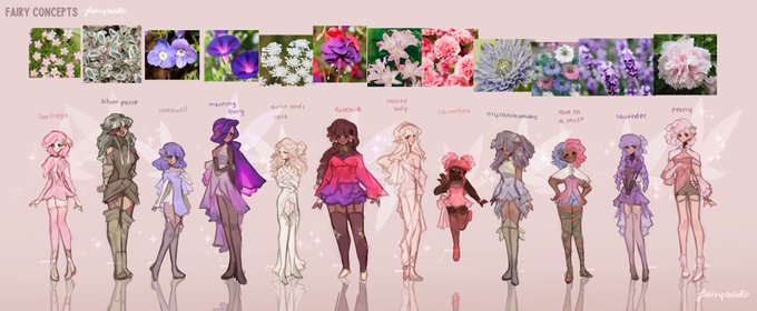 3rd times the charm!! fairies based off of flowers, thanks for suggestions! zoom in and tell me your favorite one >ᴗ<🌸🌷🌿 #fairy #fantasy #conceptart