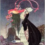 #FairytaleTuesday In the story of The Fisherman & the Genie from the #1001Nights, fishes of four different colours are presented to the Sultan. Each time the cook tries to fry them, a beautiful maiden appears and upsets the pan into the fire. Illustration by Edmund Dulac, 1907.