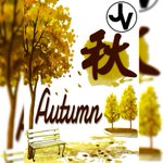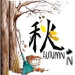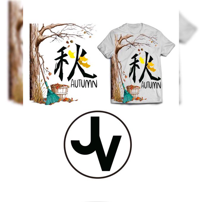 A brown trunk of a tree along with a rake, a bucket full of leaves, a kanji letter with small leaves and a plain dark text. #autumn #autumnseason #autumn2021 #fall #fallseason #fall2021 #art #artist #artwork #digital #digitalart #digitalartwork #illustration #illustrator
