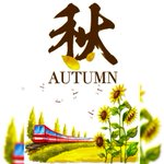 A red train along with pure grass, sunflowers and a single dark orange kanji letter in color, including a solid typographic text. #autumn #autumnseason #autumn2021 #fall #fallseason #fall2021 #art #artist #artwork #digital #digitalart #digitalartwork #illustration #illustrator