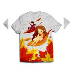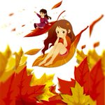 Two young girls sitting on a pair of leaves floating in the air and a large pack of leaves with color variations of red, orange and yellow. #autumn #autumnseason #autumn2021 #fall #fallseason #fall2021 #art #artist #artwork #digital #digitalart #digitalartwork #illustration