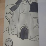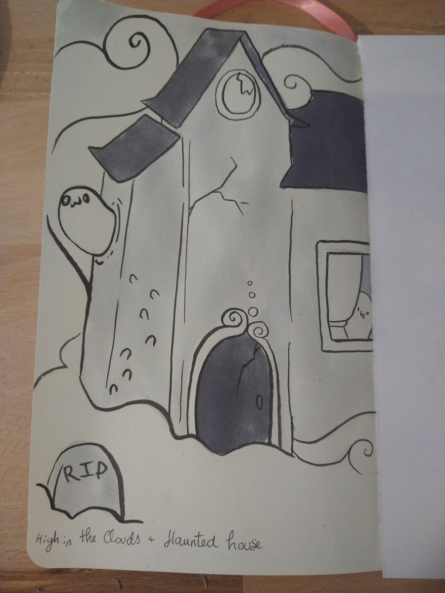 A haunted house in the clouds! Doesn't look too exciting with just half the picture but I really like how the full spread turned out #inktober2022 #Ponytober #falldrawtober2022