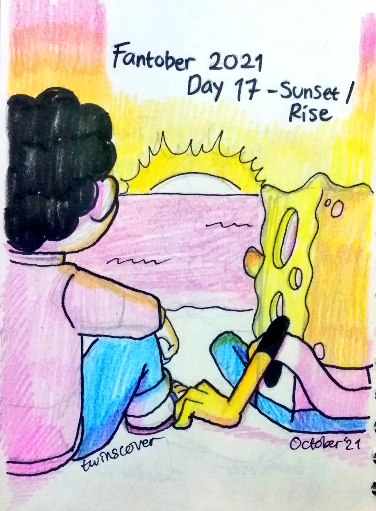 Fantober day 17 - Sunset/ rise Steven and SpongeBob watched sunset together in beach city talking about their life's. #fantober #fantober2021 #inktober #crossover #spongebobsquarepants #spongebob #StevenUniverseFuture