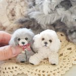#画像を4枚晒したらrtがきてフォロワーがぶわーって増えると聞いて 手のひらに乗る小さなわんこ達。 羊毛フェルトと毛糸、フェイクファー等を使って制作しています。 #needlefelt #fauxfur #acrylicyarn