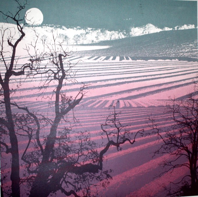 "Nocturnal Furrows" a screen-print of the ploughed fields in Winter lit by a large cold moon #prespective #furrows #trees #fields #wintermoon #moonlight #Faversham #KENT #Winterwatch #WinterWeather #printmaking #screenprinting #artwork #ArtistOnTwitter