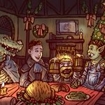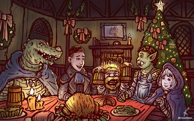 Holiday Feast With the D&D Gang and Bar-keep Fegim. Dungeons & Dragons Uria Campaign | twitch.tv/meowduin #dungeonsanddragons #characterart #dndart #fantasyart #playercharacter #christmasart #festive #tavern #feast #digitalart #lizardfolk #gnome #halforc #ale #Christmas