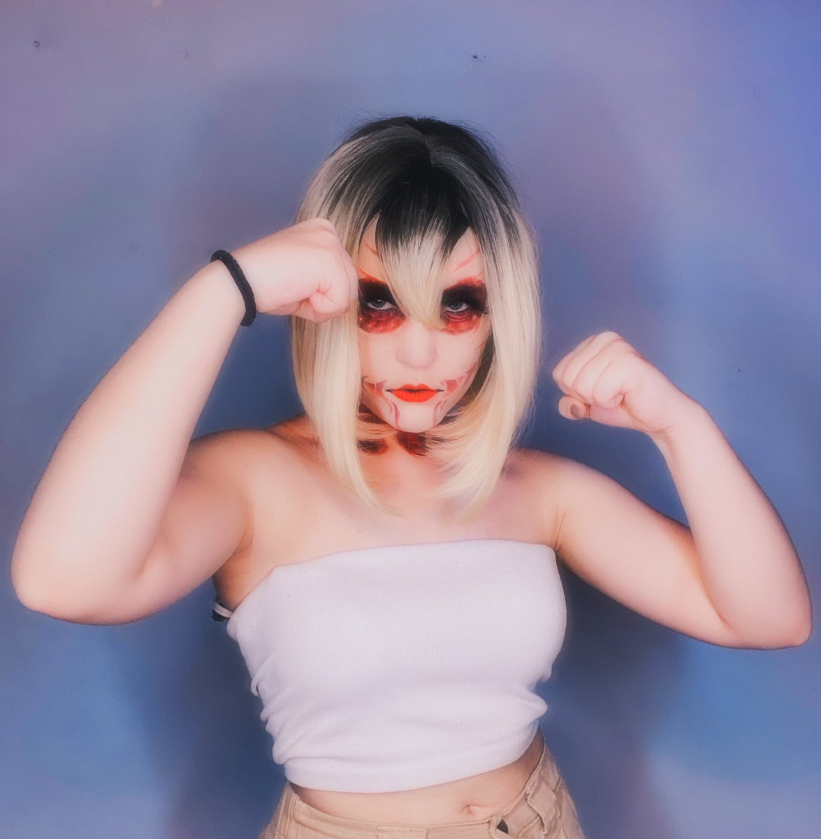 Here's my take on the Female Titan makeup from Attack on Titan for this Halloween! Levi plushie from @theotakubox ❤️#attackontitan #makeup #femaletitan #femaletitancosplay #aot #shingekinokyojin #mua