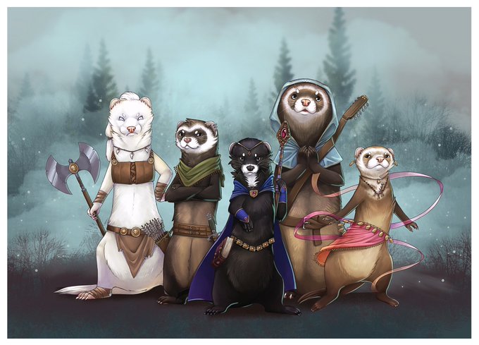 Commission for the lovely @kwsapphire who has the patience of a saint. DnD ferrets ready for an adventure! #Commissionart #ferretart #dndart