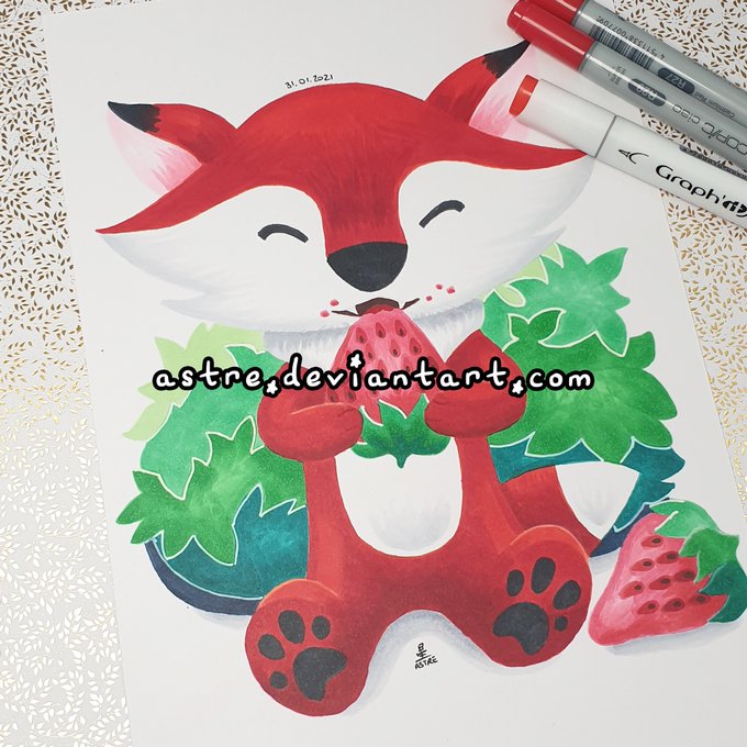 [Miam aime les fraises] French title! Its means Yum loves strawberries! Support: ko-fi.com/astrehoshi #Miam #Yum #ヤム #fox #renard #キツネ #alcoholmarkers #copic #feutrealcool #アルコールマーカー #コピック #tradi #traditionnal #artwork #illustration #art #イラスト