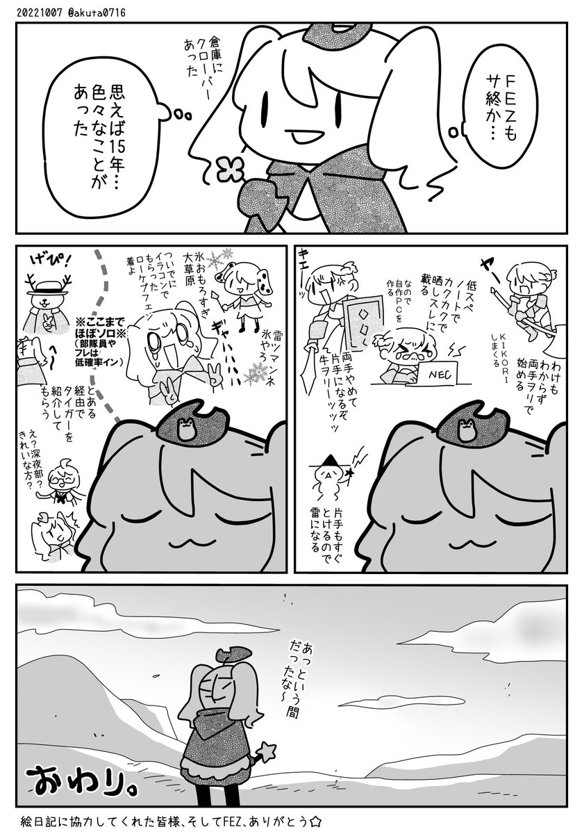 FEZらくがき絵日記をPDF版としてまとめて無料公開しました。新作描き下ろし+豪華ゲストページもあるぞ!(本文は既に公開している絵日記と同じファイルです) akuta0716.booth.pm/items/4363076 #FEZ