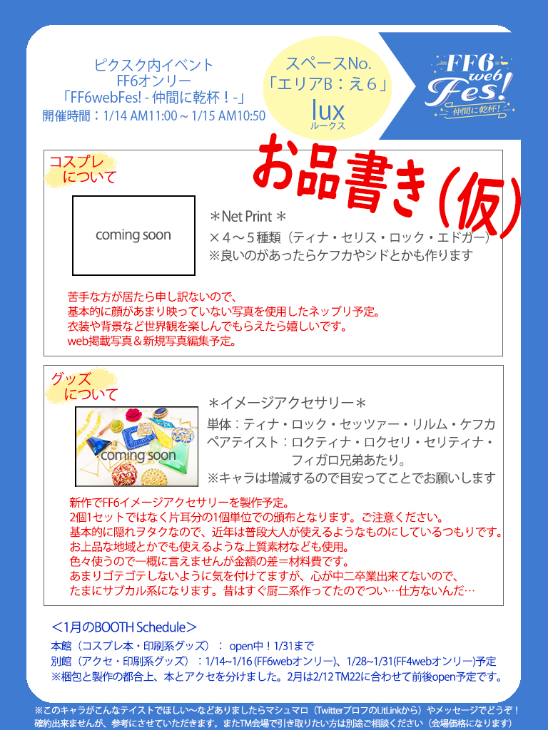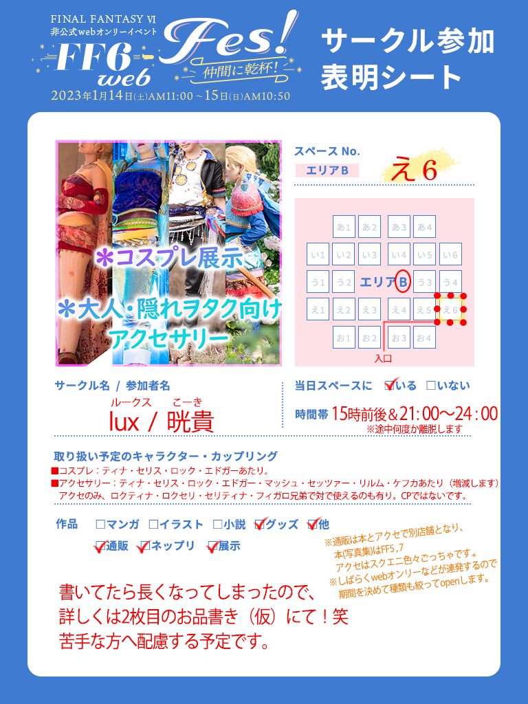 ✨🎉1/14-15 FF6 web Fes!🎉✨ に参加させていただきます! スペース▶︎エリアB い3 周年絵(ポスカ)&ミニレターセット(A4)のネップリ、小〜中学生くらいの頃に手作りしたアレソレをピクスペにて展示予定です。 新規絵はありませんが宜しくお願い致します☺️ #ff6_web_fes