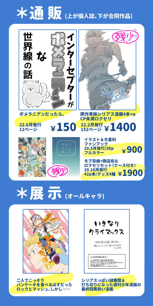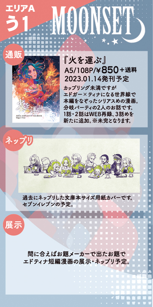 お品書きです!展示の漫画とネップリシール用のイラストが新作になります🌟 通販の頒布物はほぼ変更無いので引用RT先とツリーをご覧ください(ただし在庫はそれぞれ少なめです🙇♀️) #ff6_web_fes_おしながき #ff6_web_fes twitter.com/nami_ff6oo/sta…