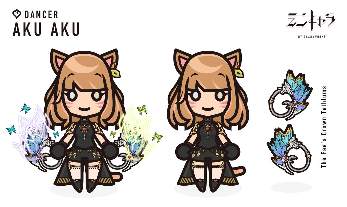 ミニキャラNo.196 あくさん(@AkuA_FF14) 依頼来ると思ってた装備✨ ティターニアきらきら武器🦋 踊り子さんの武器左右の光る色が違ってイイですね😊 可愛く舞う!踊り子ミコッテさんっ🤍 #osaraworks #FF14 #FF14ミニキャラ #FF14イラスト #ffxivart #ffxivchibi