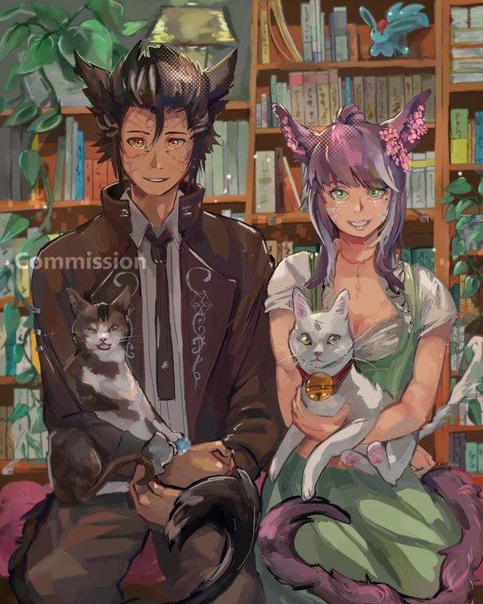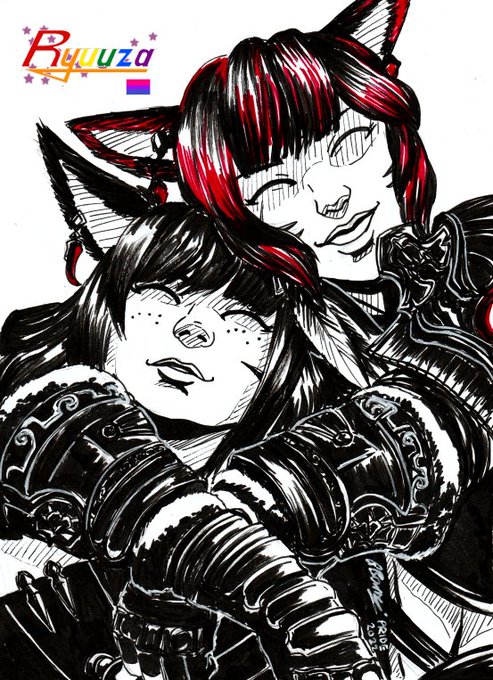 #Pride2022 commission: Two nuzzling cattes for @fullmetalwing! 💕 ----- Check out my pinned post to order a #PrideMonth character commission. 50% of all proceeds go to Stonewall UK! #Pride #FFXIVArt #FFXIVWoL