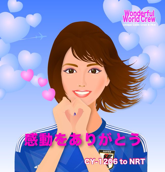 NFTアートでみんなを元気にしたいプロジェクト 『Wonderful World Crew』 応援よろしくお願いします✈️❣️ ワールドカップ日本代表🇯🇵 感動をありがとう❣️ サムライブルーのユニフォームを着て応援の オフの日のCAのHarukaちゃんは日本へ✈️ #FIFAWorldCup2022 #NFT #NFTartist #ベクター #イラスト