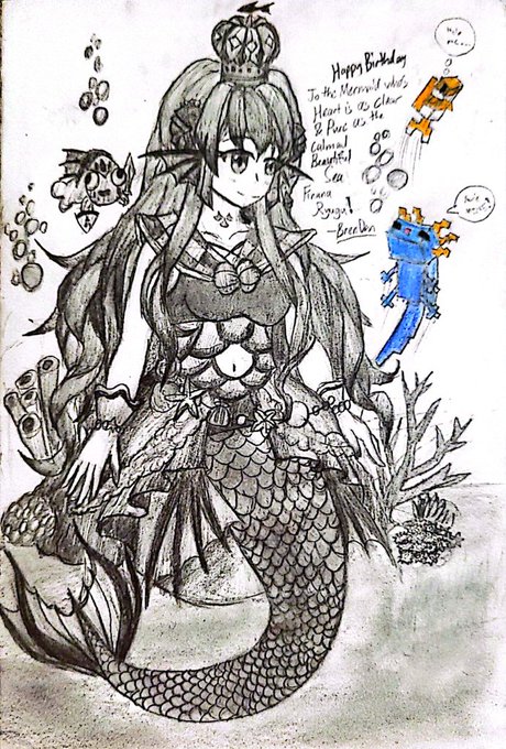 To: @FinanaRyugu #Finanart #FinanaBirthday2022 #FinanaRyugu Here's my last drawing gift to you that I promise Finana! A drawing of you with a mermaid's tail sitting on a Rock with a few corals underwater with a Ryuguard. Also I put a 🟦 Axolotl chasing a Minecraft 🐠 for fun😊