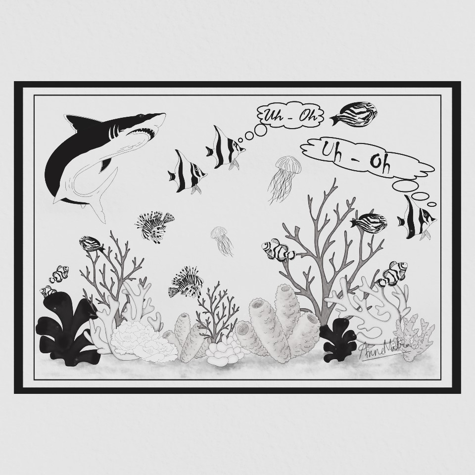 Day 27 & 29 – Snack & Uh-Oh Uh-Oh, The Big, Bad Shark is back, Let’s scram out of here, before we become his snack! #art #artwork #inktober #inktober2022 #inktoberchallenge #penandink #watercolor #shark #ocean #sea #underwater #fish #fishes #coralreef #bay #atelierannemitra