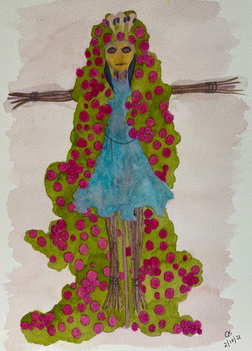 Today there is a scarecrow on the lawn of the house. The ravens are unafraid. The roses have returned to climb it. No one comes to pick them. Those who watch pose next to it for photos, smiles broad and a little smug. #inktober2021 #inktober #stuck #flashfiction #spookyseason