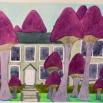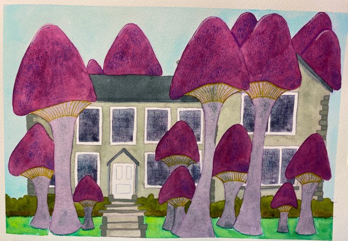 Today enormous mushrooms have sprouted in a ring around they house. Fine golden spores rain gently down from them. Those who watch find themselves gently drifting on glittering clouds, content, serene. They flee. #inktober2021 #inktober #sprout #flashfiction #spookyseason