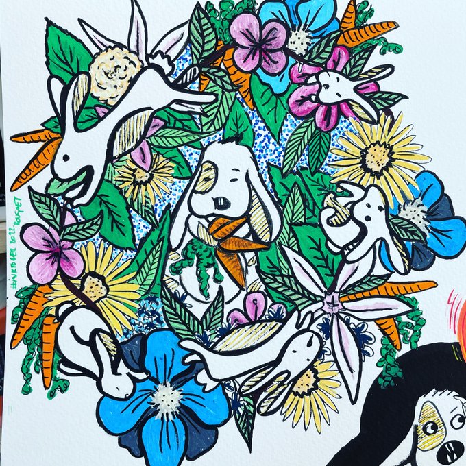 Inktober 2022 - jour 6 Bouquet Face A et B #lasupermini #fleurs #inktober #inktober2022 #bouquet #dessin #posca @inktober #lapin