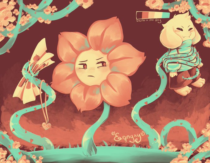 Day 3! The prompt was thorns, hope it's a pass even tho they are not the main focus here xD The color palette I picked is "Castle in the Sky" and I drew my favorite Undertale character(s) #undertale #floweytheflower #asrieldreemurr #drawtober kinda