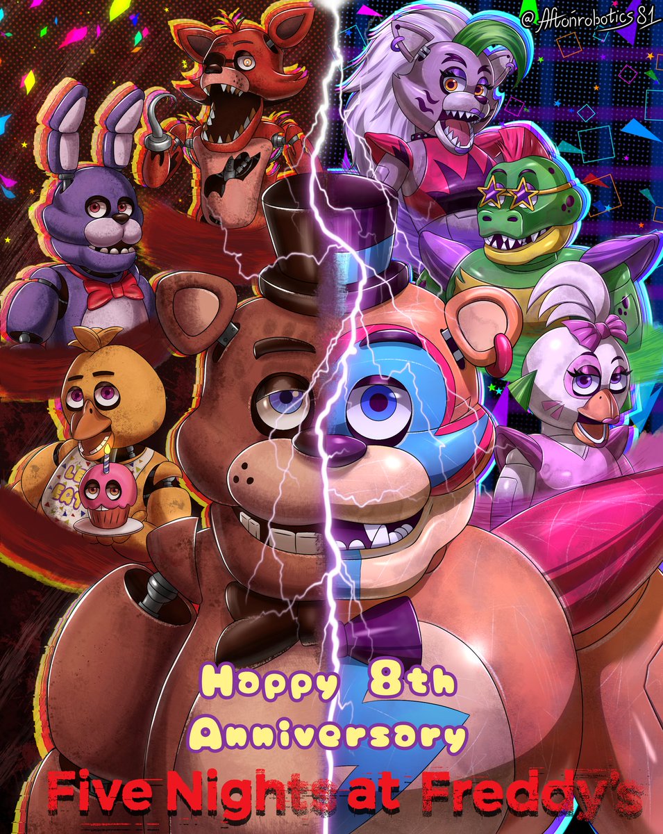 Happy 8th Anniversary! 🐻🐰🐤🦊 During these eight years, my love for this franchise has only grown. I can't believe it's been 8 years since the first chapter of fnaf was published :) #fnafsecuritybreach #fnaf #fnaffanart #fnafanniversary