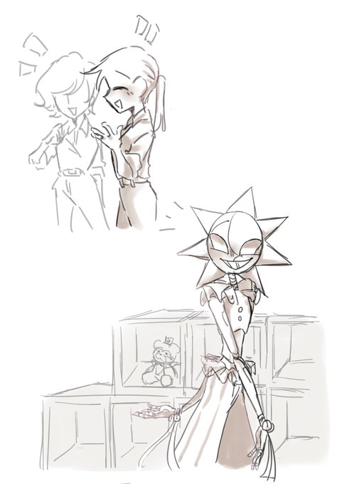 Forgot to post this when I drew it but here's a quick sketch of my updates to my Sun and Moon + updated style that I draw all my ocs in now! #fnafsecuritybreach #fnafsundrop #fnafmoon #fnaffanart