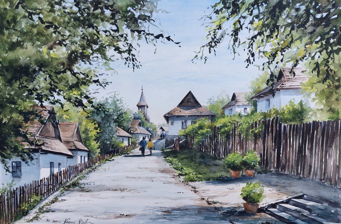The village of Palóc, built in the 17th and 18th centuries, is an example of Hungarian folk architecture. Hollókő Castle was built on the hilltop in the 13th century. UNESCO World Heritage Site. My watercolor work. #art #watercolor #painting #folk #Watercolourpainting