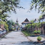 This is my painting "Calm Dawn". The original is for sale (please DM me if interested!) and you can also find very nice prints f it here: fineartamerica.com/featured/calm-… #art #paintings #artprints #woman #village #folk #autumn #fall #stripes #kunst #hills #trees #paths #artprints