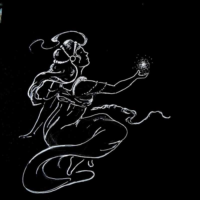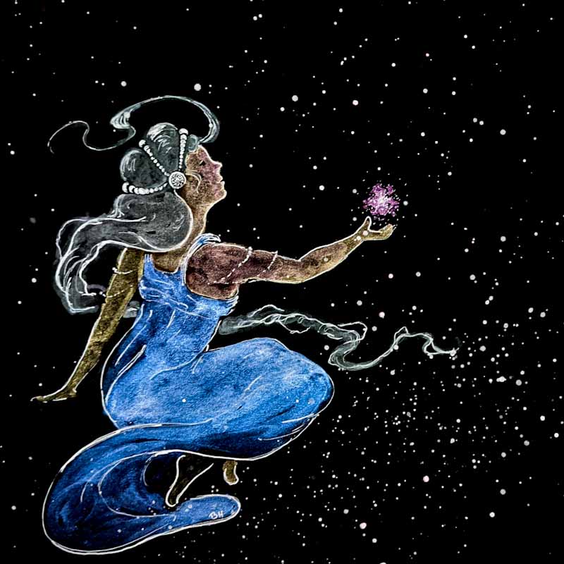 #FolkTaleWeek2021 final day is #sky, and this one is full of star. Camera refuses to portray the full majesty of the shimmery, iridescent paints I've been using. I like her enough that I might try to do a traditional type of watercolor of this, though. #illustration #tarot