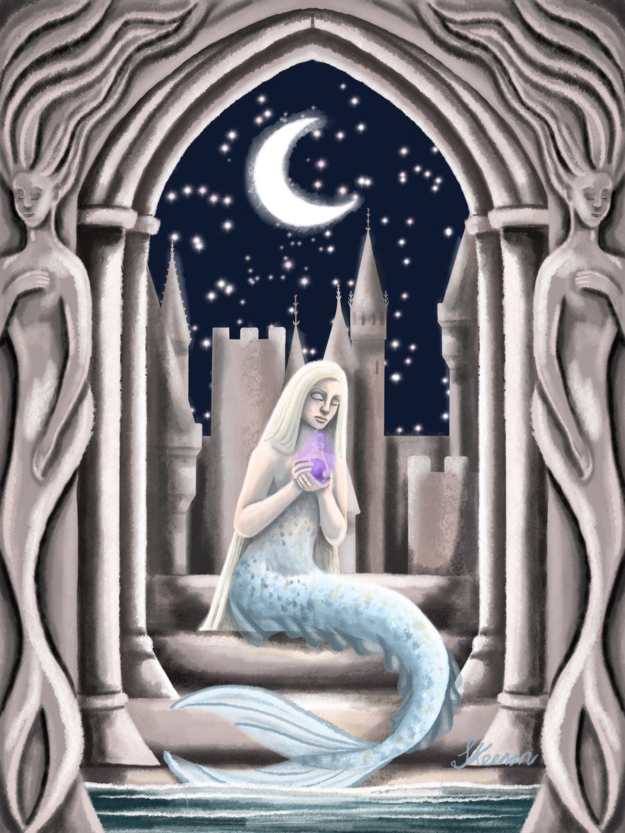 Folktale Week Day 6 - Potion. The Little Mermaid sits on the steps of the Prince’s palace, about to drink the potion that will make her human @folktaleweek #folktaleweek2022 #folktaleweek #art #illustration #kidlitart #artistsontwitter #CHILDRENSBOOK