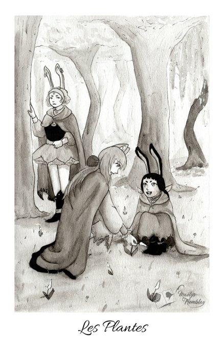 [INKtober 2021 - Cycles] Jour 6 - Les Plantes #inktober #inktober2021 #cyclesinktober2021 #bunnygirl #forêt #trio #noiretblanc #encre #aquarelle #illustration #art #dessin #original #traditionnel #inktoberchallenge #nature #printemps #ciel #jour #fleurs #cueillette #nekogirl