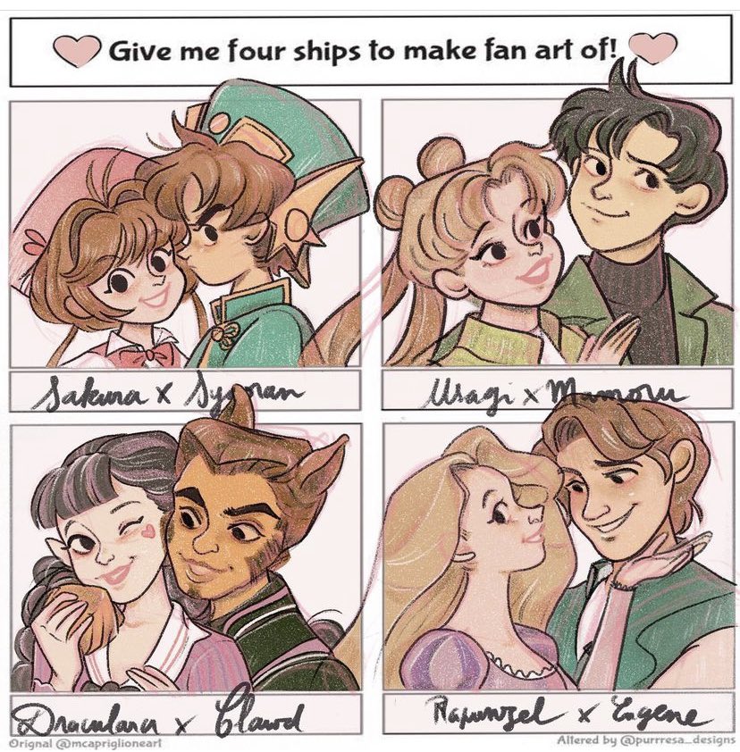 *casually comes back to Twitter after almost a year* which is your fav couple??🥲💓 #couple #ValentinesDay #fanart #SixFanarts #fourships #sailormoon #CardCaptorSakura #MonsterHigh #love #disney #Rapunzel #CoupleGoals
