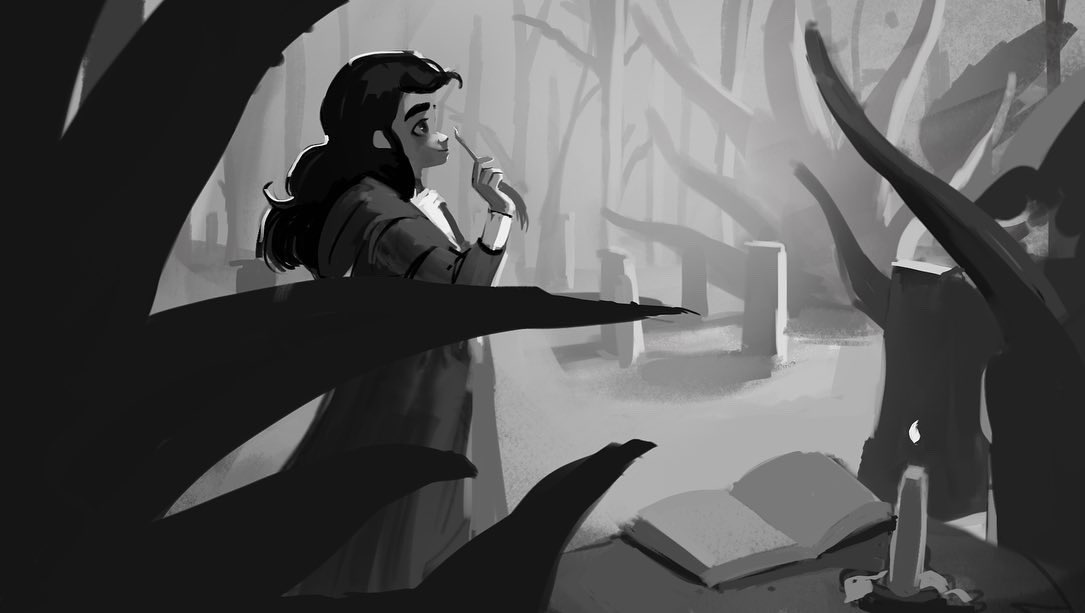 Concept art of Francisca Imelda and Herneval at the graveyard from a first version of #Frankelda first episode cold open, that was later changed. @CinemaFantasma