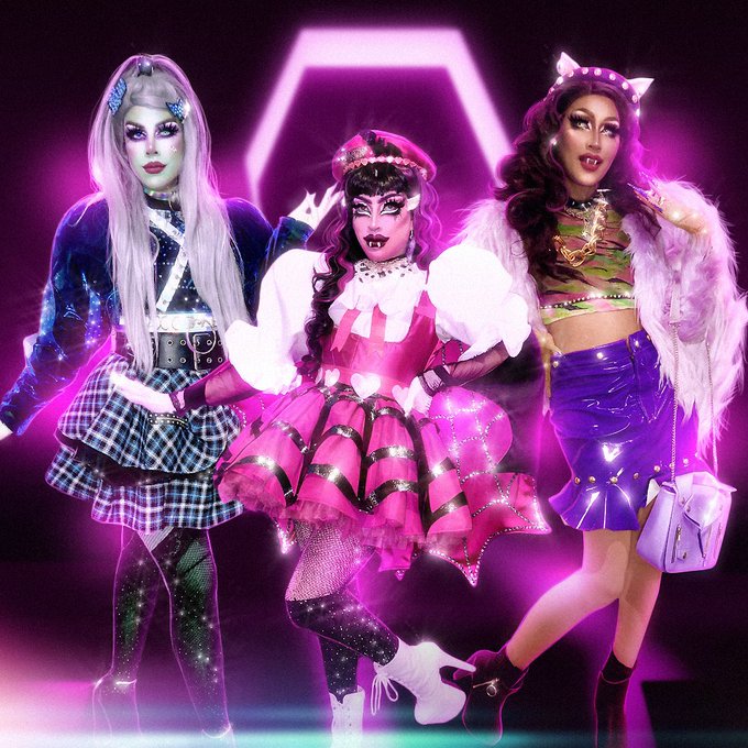 Hi boo crew!!, Monster High just got a little bit sickening!! 🦇💖💀 @MonsterHigh 🦇 #Draculaura @alexdnight ⚡️#Frankie @AlexNificent 🐾 #Clawdeen @emilia.venti #monsterhigh #mattelcreations #hauntcouture #dragqueen #cosplay