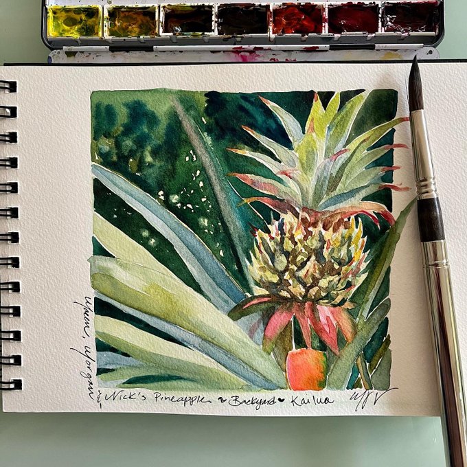 Baby Pineapple ~when family visits the in-laws here they get to plant pineapple in the garden. This lovely one will go to my nephew and his family when full grown and ripe. Viv and I will plant ours today yum!🤗🍍#Watercolor #hawaii #fridayart