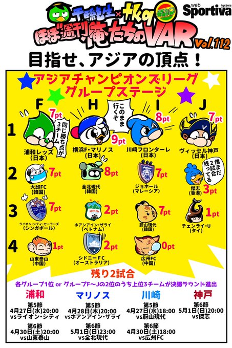 【ほぼ週刊俺たちのVAR⚽】 地獄の短期決戦もいよいよ終盤! 各グループリーグの首位に立ったJクラブ! このまま決勝ラウンドに全チーム突撃だ!!! #俺たちのVAR #ACL2022 #浦和レッズ #fmarinos #frontale #ヴィッセル神戸 #Jがアジアを熱くする 連載一覧 lnky.jp/TDjQHMC