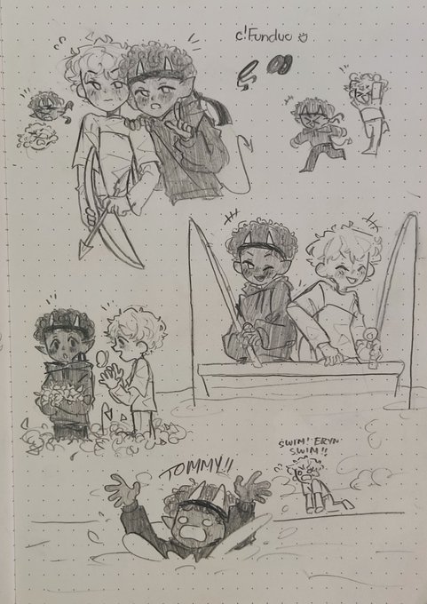 page of my sketchbook :D c!tommy with butterflies + bees ft. tiny c!funduo at the bottom #tommyinnitfanart #erynfanart #dreamsmpfanart #funduo