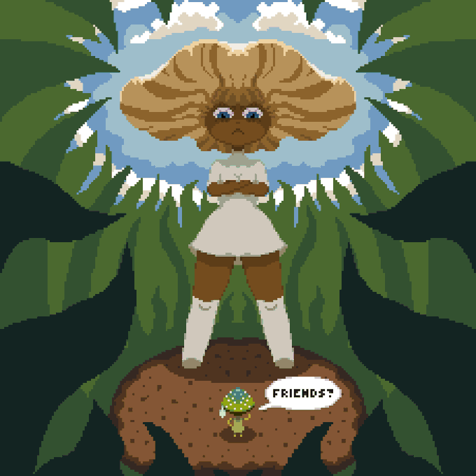 Can we make this friendship work? My silly depiction of the Macrocybe Titan and the Green Skin-head fungi. 😄 #pixelart #funguary #funguary2023