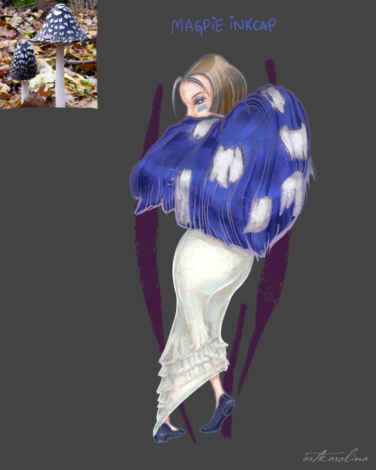 Day 2 - Magpie Inkcap Looks like my tweet failed to post yesterday. This one, I was going for a mysterious cougar vibe because the texture reminds me of a fur coat. #funguary #fungus #funguary2023 #mushrooms #mycology #naturesketch #characterdesign