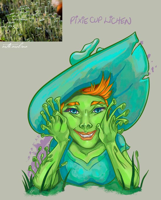 Day 4 - Pixie Cup Lichen By drawing this, I discovered the inspiration for Shrek. 😮One franchise I never expected to take off and last so long is the Shrek franchise. #funguary #funguary2023 #mushrooms #fungus #mycology #characterdesign #digitalpainting #affinitydesigner