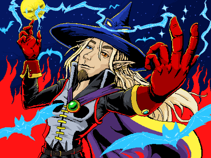 Idle Champions Fanart Monday! This is Lucius, an Elf Sorcerer. I decided to draw every drawing with Halloween theme this month. So Lucius is wearing now his Halloween suit. #pixelart #idlechampions #gamecharacter #lucius #elf #sorcerer #halloween