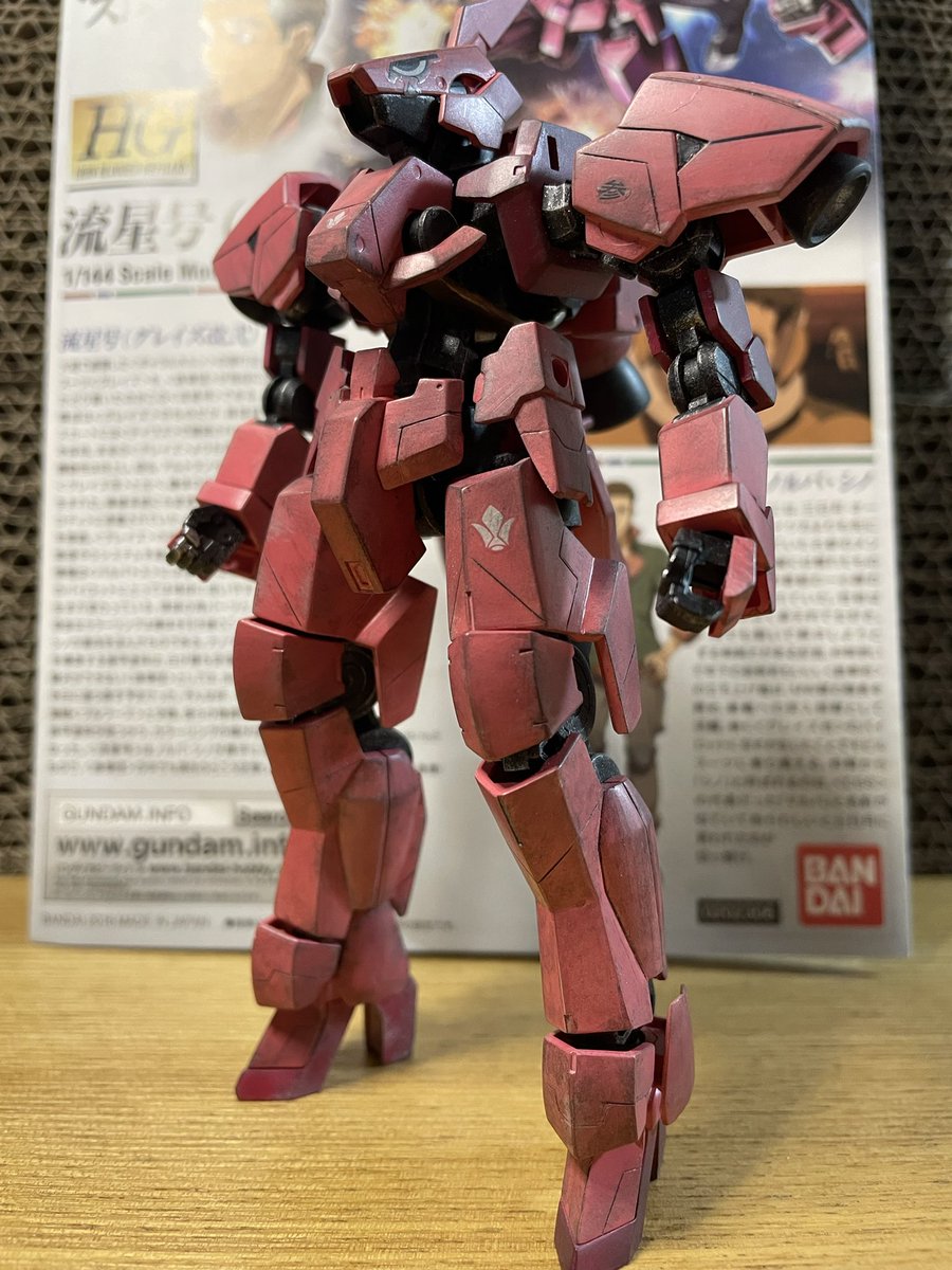 流星号(グレイズ弐改)制作7日目 全塗装、デカール貼りをして結局汚しました❗️😆 ウェザリングカラー&マスターそしてタミヤカラーを使用。 私の汚しはこんな感じです。 次は仕上げコーティングをして完成。 #ガンプラ #ganpula #ガンプラの画像貼るとRTされると聞いて
