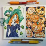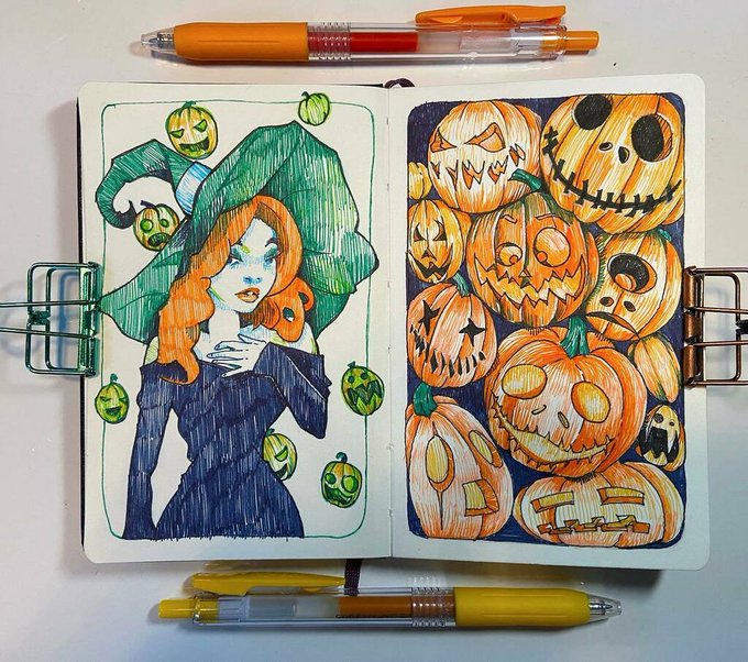 First double spread for my new book!! This still counts as #inktober right? #sketchbook #gelpens #sarasapen #pumpkin #halloween #characterdesign #illustration #art #sketch