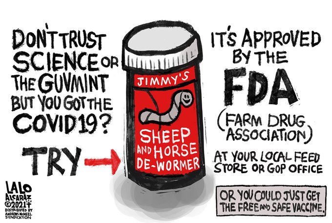 This cartoon sponsored by JIMMY'S SHEEP AND HORSE DEWORMER. Please share #laloalcaraz cartoons. (and #getvaccinated)