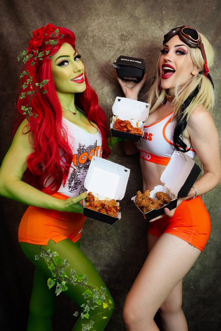 Harley and Ivy @Hooters girls. But since there’s apparently a wing shortage right now, we had to raid @BWWings and steal all theirs. 😂 @harleyquinn505 as always is my partner in crime. Photo by @David_Turner_84 ✨💕#batman #HarleyQuinn #PoisonIvy #cosplay #LGBTQ #girlskissing