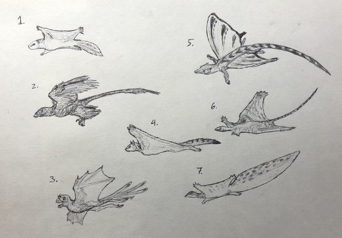 Some prehistoric gliding fauna for my #glidingapril2022 special tomorrow! 1. Volaticotherium 2. Microraptor 3. Epidexipterus 4. Maiopatagium 5. Coelurosauravus 6. Sharovipteryx 7. Hypuronector